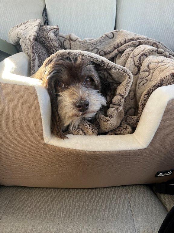 Toque spent the drive hunkered down in her travel basket trying to keep warm. We have heated seats in the front of the car but not in the back plus there is no direct heating into the back seat either. She just curls up under her blanket and sleeps soundly until the car stops.