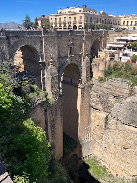 Ronda is a mountaintop city in Spain’s Malaga province that’s set dramatically above the gorge which we drove down into to get the photo. Some hardy souls walked down to get the photo and then had the unhappy task of walking back up. We utilized our huge urban assault vehicle to save four of them making that tortuous trip back up.