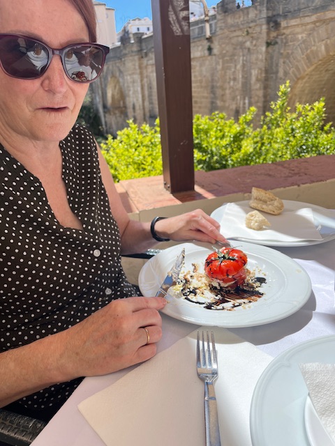 We’ve been indulging (overly) in the Spanish cuisine and been enjoying the variety. Sometimes we think we make some educated guesses from the menu and in this case, it was a called a “tomato and goat cheese salad with dressing – well we go that wrong. It was one tomato with some goat cheese in it – not quite what we have bargained for but oh gosh, it was yummy.