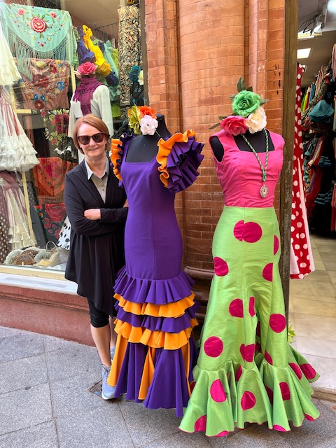 Lots more flamingo dresses for sale and this is all in preparation for the Fair of Seville beginning on Sunday. Our timing in Seville could not have been better as we have been very fortunate through our friends here to be invited to a unique experience on Sunday. We won’t spoil they surprise for now. What we will mention is that it is a little bit like the Calgary Stampede where everyone dresses up in cowboy hats, big buckles, boots, very short shorts and checked shirts. Everyone here though gets dressed in flamingo dresses with all the accoutrements such as shawls, fans, flowers in the hair and tap shoes. The guys – not so much🤪