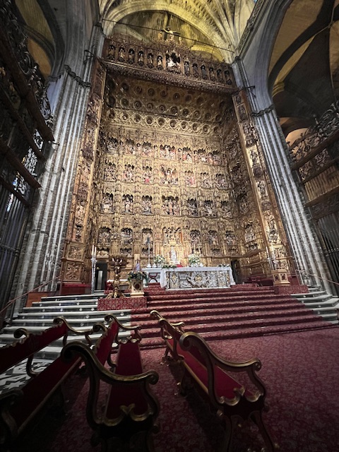 it does have the biggest altar and it is not just immense but very intricate and gilded with many tons of gold leaf. The history of this cathedral is complicated as is most of Spanish culture especially when you had Romans, Muslims, Jewish and Catholics involved. Somehow, taking out the Romans, the other three have co-existed in harmony for centuries. The cathedral is currently catholic but was originally built on Roman buildings by the Muslims…….hmmm, just a little mind bending.