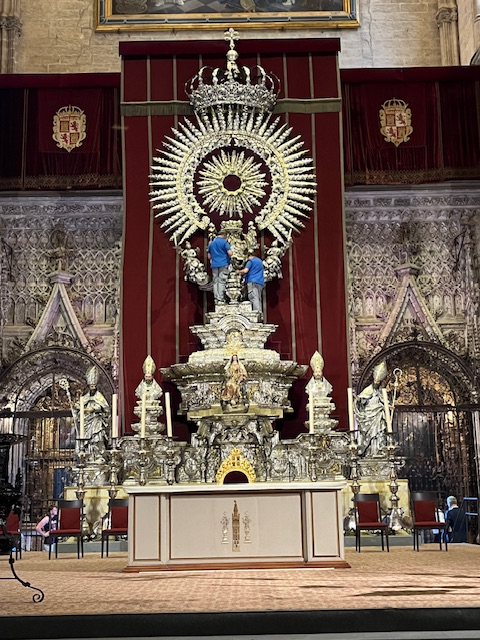 This is the people’s altar which is a third the size it was originally was. You can get an idea of the dimension by the two guys up there polishing the silver. That would not be the pick of the jobs in the church. Christopher Columbus’s tomb is also in the church which didn’t turn out real well in our photos, but there is some conjecture as to whether it is really there or not. When Napoleon was advancing into northern Spain, they moved his body from there to another spot in Spain and then had to move it again for the same reason. Finally, they found a resting spot for it in Sevilla and hence the uncertain as to whether it is really in the Sevilla cathedral or not.