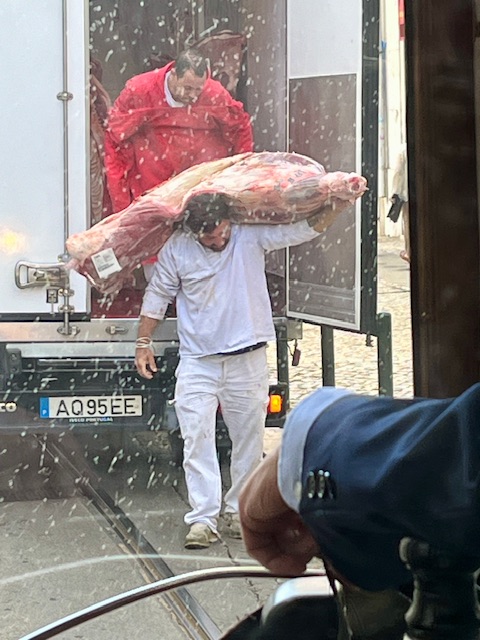 We did a quick circuit around the eastern hill on the tram and ran into this chap delivering what looked like half a cow.