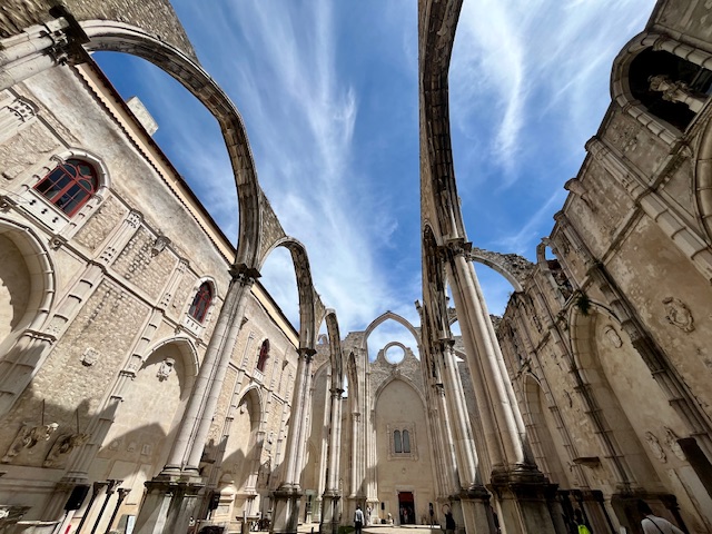 On our travels we visited the church with no roof. It houses an archeological museum but also serves as a reminder to people to remember the damage that was done in the 1755 earthquake that flattened the whole city. The earthquake in 1755 set off quite the chain of events. Firstly, the quake itself that had people running away from the hills down to the low land which was down near the waters edge. On their arrival there, they found the “seas had parted” and many went down onto the exposed estuary which very quickly then filled up with a tsunami as the epicentre was 200km southwest of Lisbon. To add final insult to injury, the city burned because the people that ran from their homes left their candles burning.