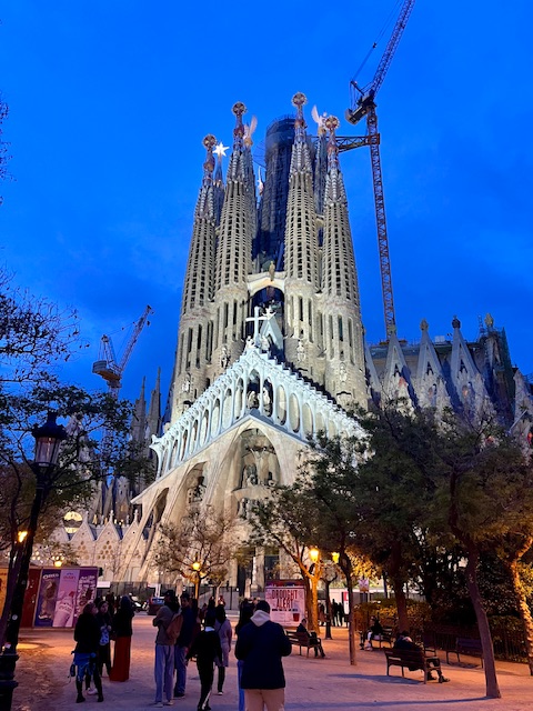 Following dinner at our favourite little restaurant called K.ersol (play on words) we wandered back towards the Sagrada Familia to see what it looked like at night. We had been told they light it up and as we arrived at 9.00pm the lights came on and the bells tolled.