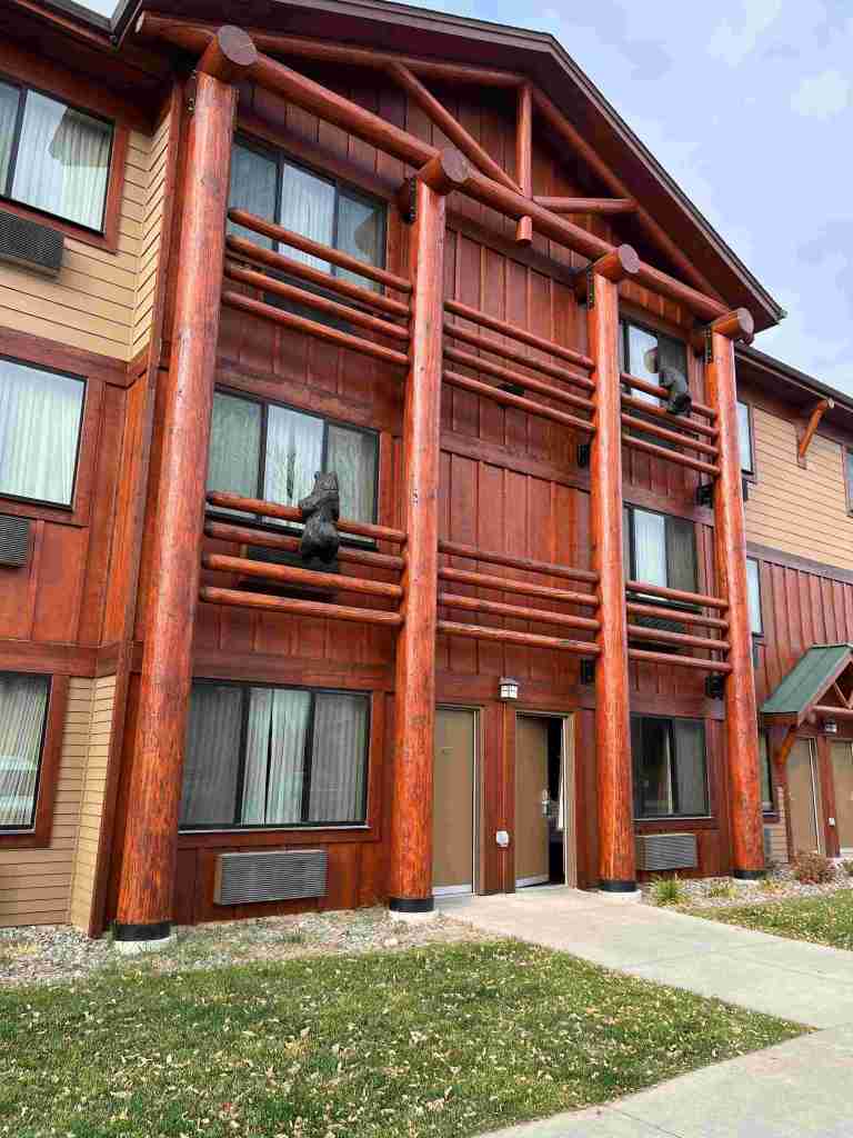 The Best Western that we stayed in Billings last night was perfectly satisfactory. They even had freshly made cookies on the front reception desk when you booked in which we could have well done without. Around the outside of the hotel where all the beautiful dressage wood had been installed, were a number of black bears climbing over the framework. Quirky and fun.