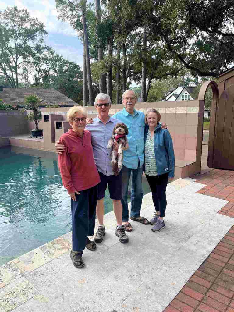 This is a photo of their pool from roughly the same spot in 2017. Their pool is in the front entrance courtyard and the bayou is behind the house and down about 20 meters. They ended up being out of their house for nine months.
