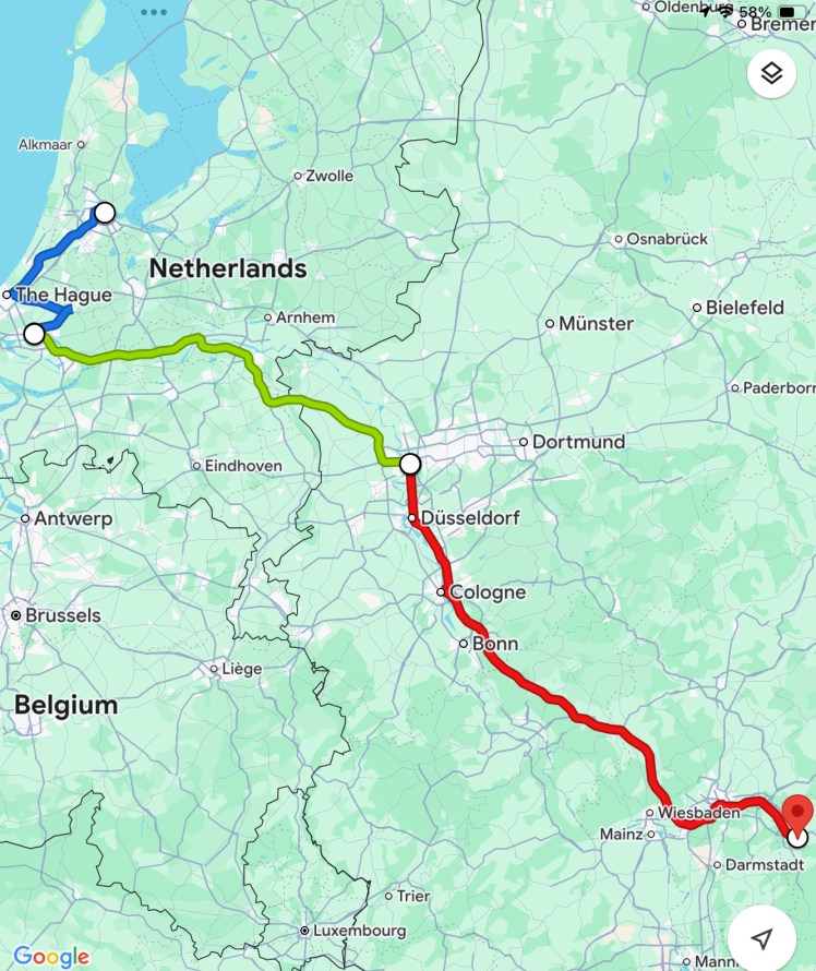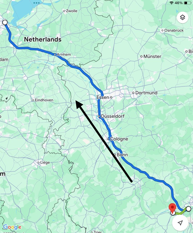 All going well and providing all of us arrive safely in Mainz we will all split off and go our separate ways. Jen and Al to Berlin to meet up with their daughter who has flown over from San Francisco to join them for a holiday; Neal, Randa, Gabby and Linda will drive to central Switzerland to the Jungfrau for some mountain hiking. We will train to Hilversum in the Netherlands for a weekend of R&R with Al and Ads and spend the time chewing the cud and taking Brontë their gorgeous dog for walks on the Haida.