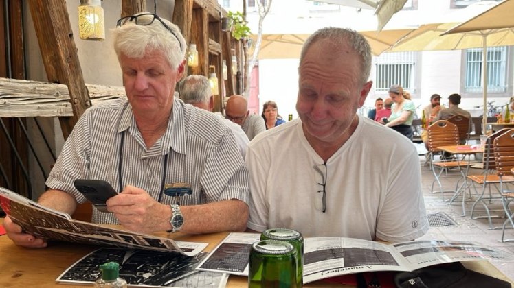 The common denominator between the four couples is Di and Fras so this was the first gathering of the “clan” who will now be semi-adhered to at the hip for the next seven days whilst we bike down the Upper Rhine. Hopefully we will find someone tomorrow who will take a photo where we will all get included. Lots of joviality and then a scattering to reconnoiter tomorrow.