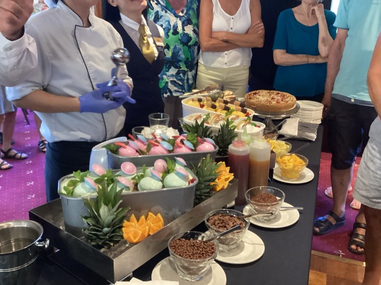 After a cold shower and a load of washed laundry littered around our cabin, we went upstairs for our afternoon coffee and cake. We are definitely not losing weight on this trip. Due to it being so warm, they have put together a beautiful display of ice cream which we are appalled to say was rudely devoured by our fellow travelling companions. There was some semblance of queueing but definite FOMO behaviour evident and this was from a group of people with an average age of 65 years – so sad to see. There was more than plenty to go around. Goodness knows what the staff thought of these plebs.