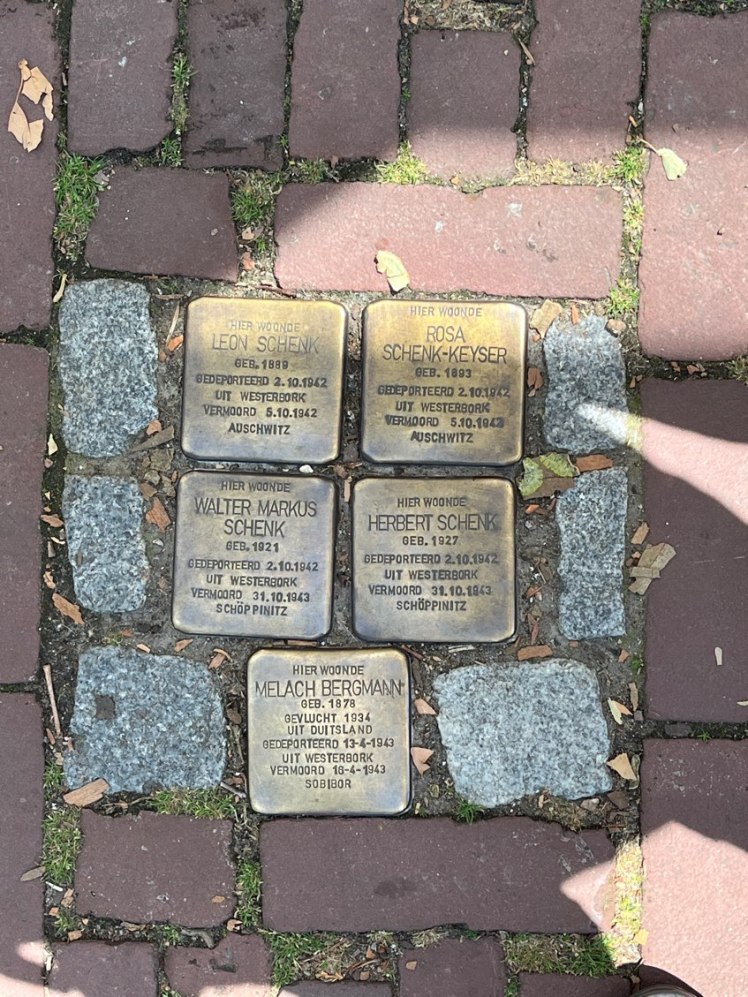 In Gouda, and other places throughout Germany and the Netherlands, there are “Stolpersteine”or “stumbling stones,” which are small, brass plaques embedded in the pavement in front of homes where Jewish people lived before being deported and murdered during the Holocaust.These stones serve as a memorial to the victims, bearing their names, birthdates, and the places of their deaths, often concentration camps. The Stolpersteine project, initiated by German artist Gunter Demnig, aims to commemorate each individual victim by placing a stone at their last freely chosen residence.