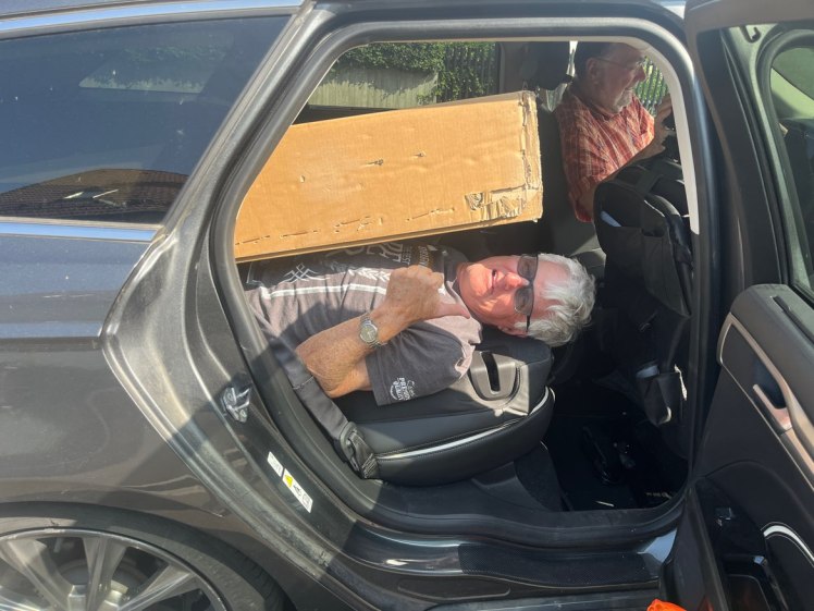 Next crazy task was to go to a local bike shop who gave us a free box. The only way to get it in the car was to put the back seats down and for Fraser to lay under the box!!!! We have done some crazy stuff at times but this is up there.