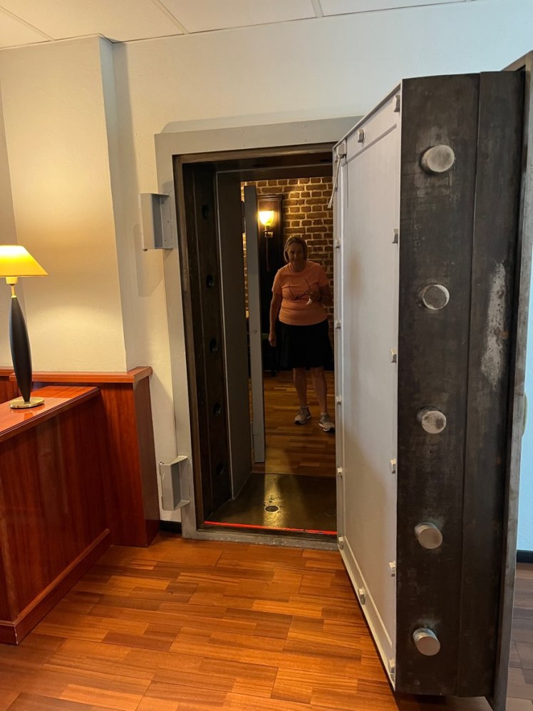 Our hotel tonight is a retired bank with a wine bar in the main vault. We also ended up with a corner suite which was large enough for us to ride our bikes around.