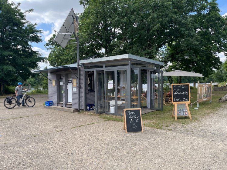 We came across this wonderful kiosk that was unmanned about half way along our route. There was a thermos with hot coffee for €2 a cuppa and an honesty box. There was also a fridge with non-alcoholic beverages with an honesty box. Thirdly, there was another fridge with alcoholic beverages with an honesty box. A group of older guys on bikes partook of the latter. We are noticing just how much beer is drunk in this country, and it is a hell of a lot.