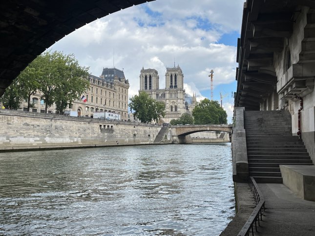 We had some dinner at one of the cafes but made a fatal error by having a charcuterie board – money poorly spent as the meat and cheese were well below par. Time then to make our way towards the Louvre by walking down at the water’s edge of the Seine which was nice and cooling but the surface was treacherous. The Seine often floods and it washes the sand and grout away from the cobblestones leaving them exposed and uneven. We thought it a good idea at the time but would not recommend it.
