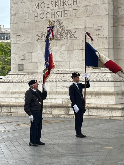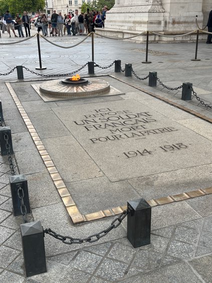 At the tomb of the unknown soldier at the base of the Arc de Triomphe, every evening at 6:30pm, veterans lay wreaths decorated with red, white and blue near its flickering flame. The flame is also rekindled. It burns in the darkness to recall the sacrifice of an unknown French soldier who gave his life during World War I. We were so lucky as we caught the tail end of it and it was moving as these ceremonies always are.